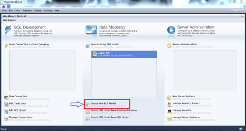 Lors de l'ouverture de MySQL Workbench, le logiciel s'ouvre sur une page d'accueil. Une fois la page d'accueil ouverte, il vous suffit de cliquer sur Create New EER Model (qui se situe en bas et au milieu de l'écran).